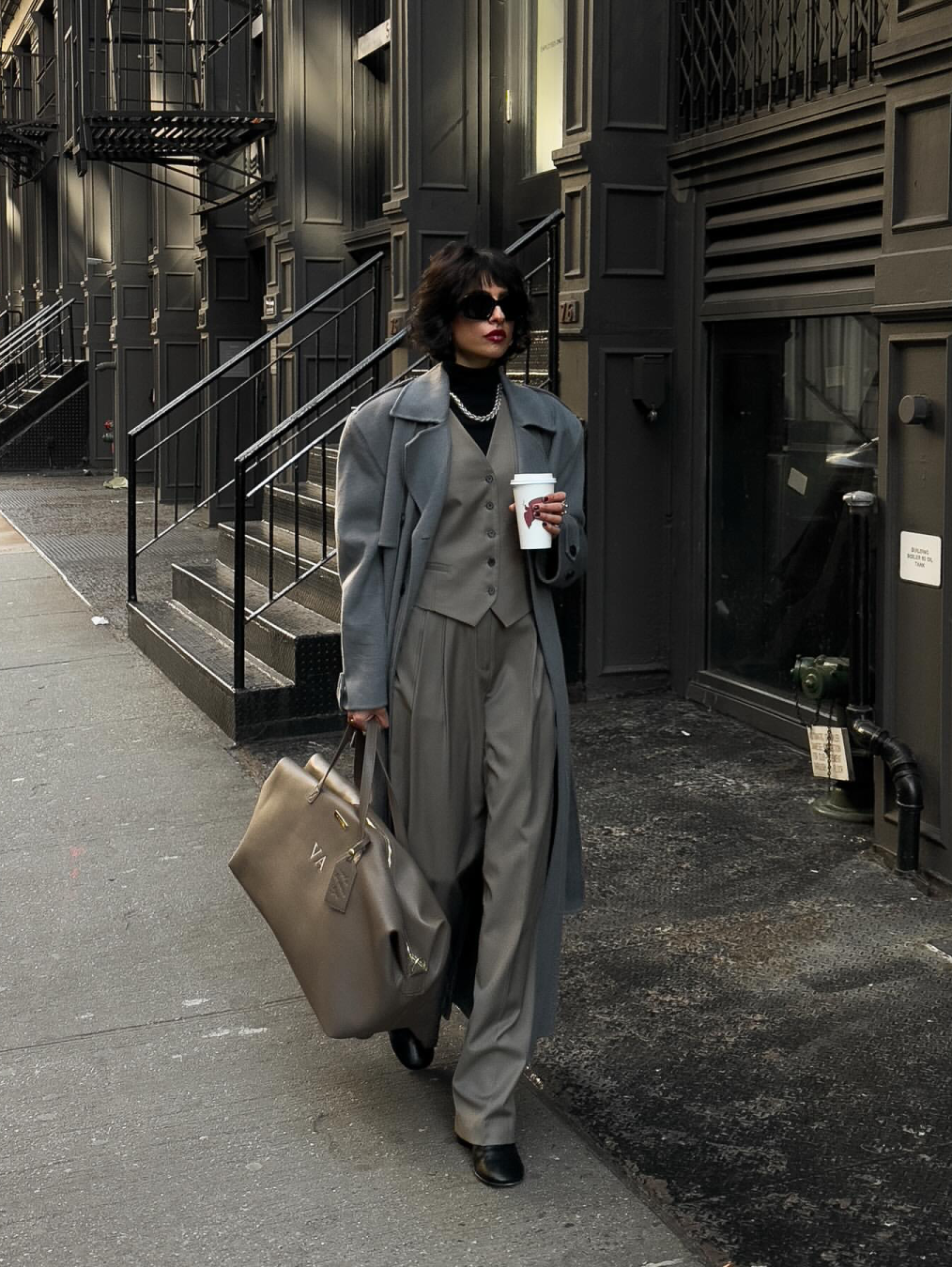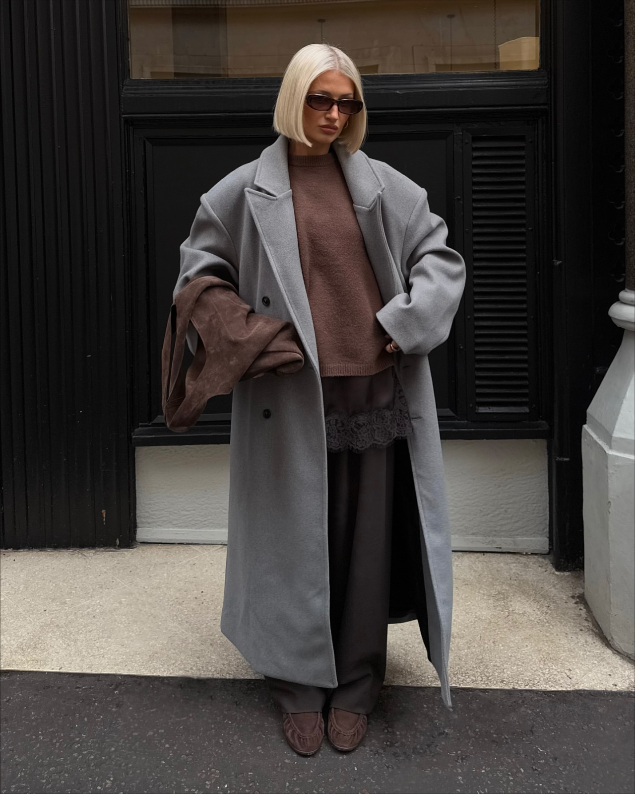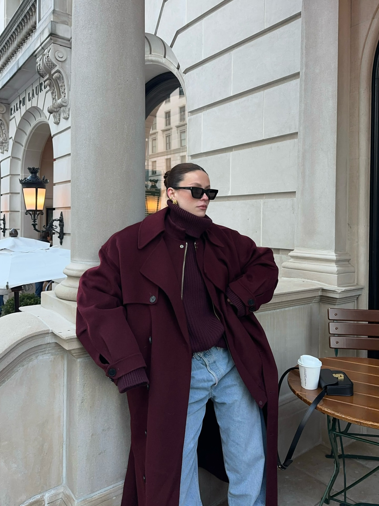 肩線俐落、長度過膝的大衣根本就是「疊穿框架」,走路的時候線條超流動,裡面的疊搭看起來就又鬆又乾淨。