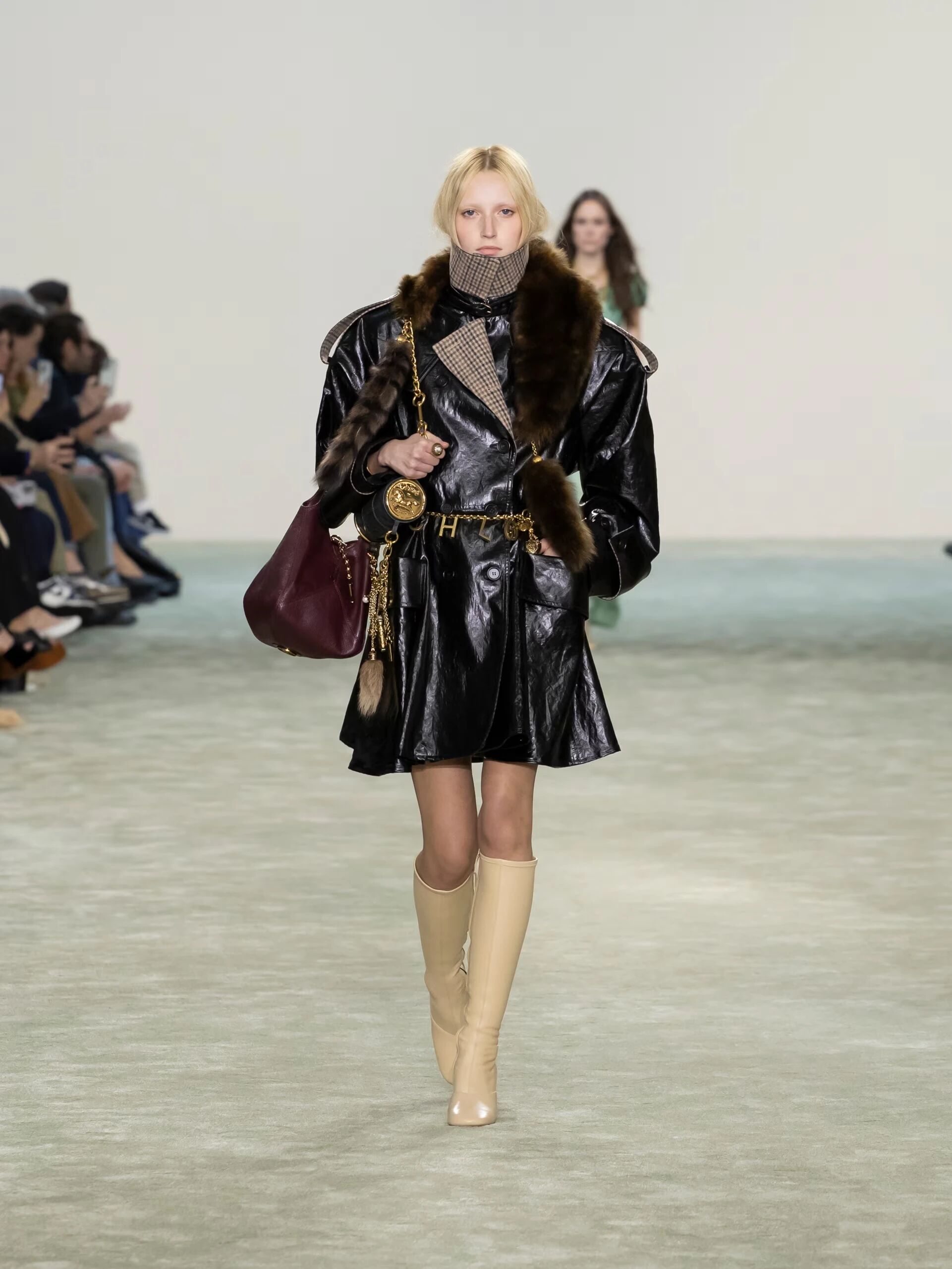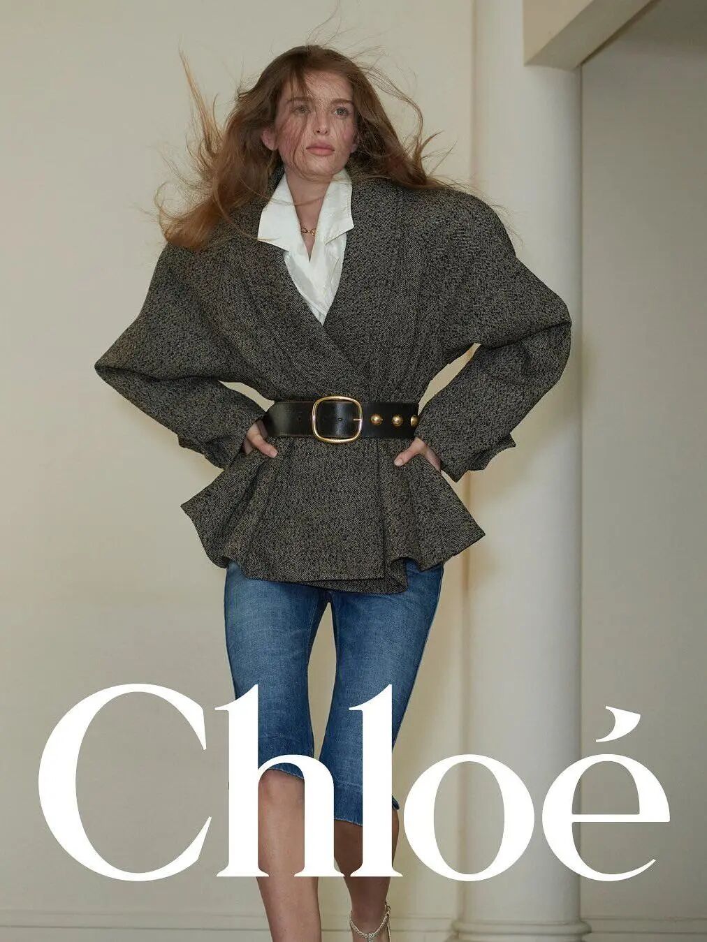 Chloé的詮釋則更柔和。在寬肩設計中融入更多自然肩線,收腰處理也更加微妙,帶來更浪漫的解讀。軟呢或羊毛面料,肩部柔和,腰帶一繫,就勾勒出慵懶又精緻的復古曲線。她好像在尋找一種平衡——介於力量與溫柔、男性與女性、過去與現在之間的完美平衡~