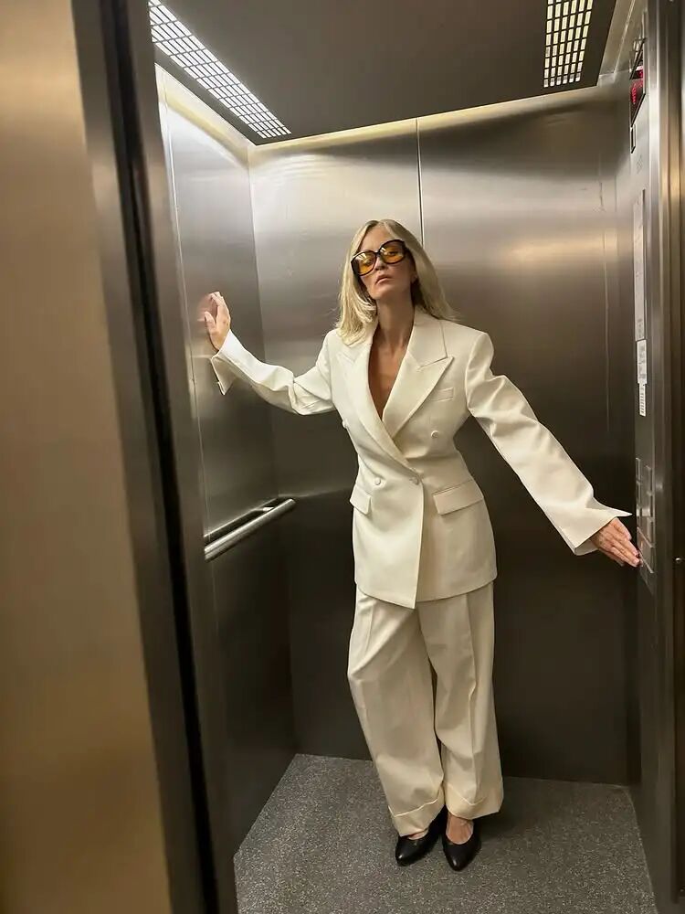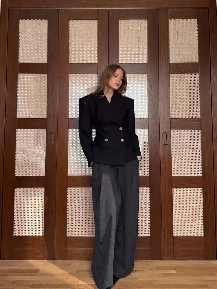 如果是西裝類型的收腰外套,最佳拍檔絕對是闊腿褲!上窄下寬的輪廓形成一個完美的Y字形,既能突出纖細腰部,又透過闊腿褲拉長下半身線條,氣場直接兩米八~