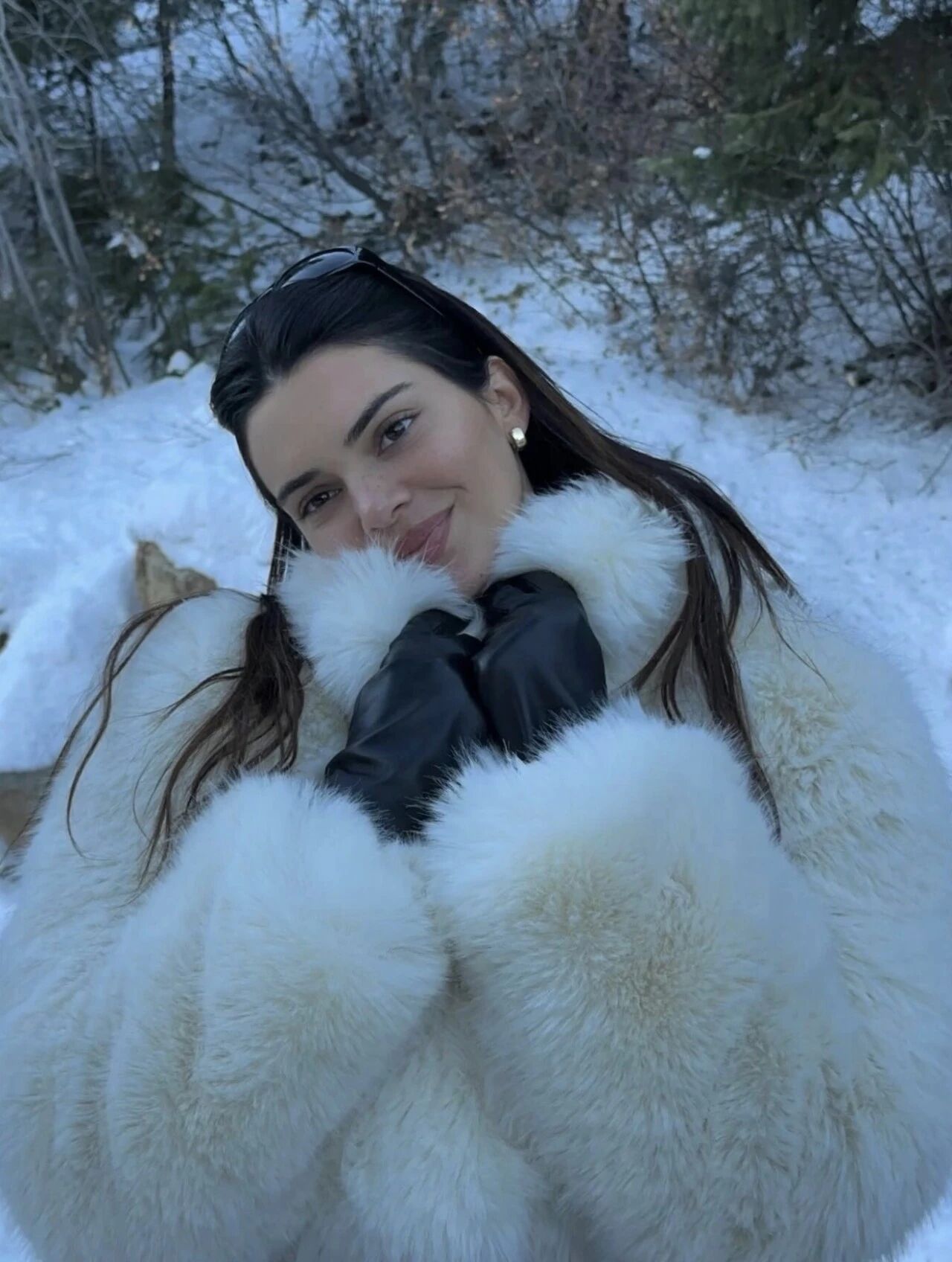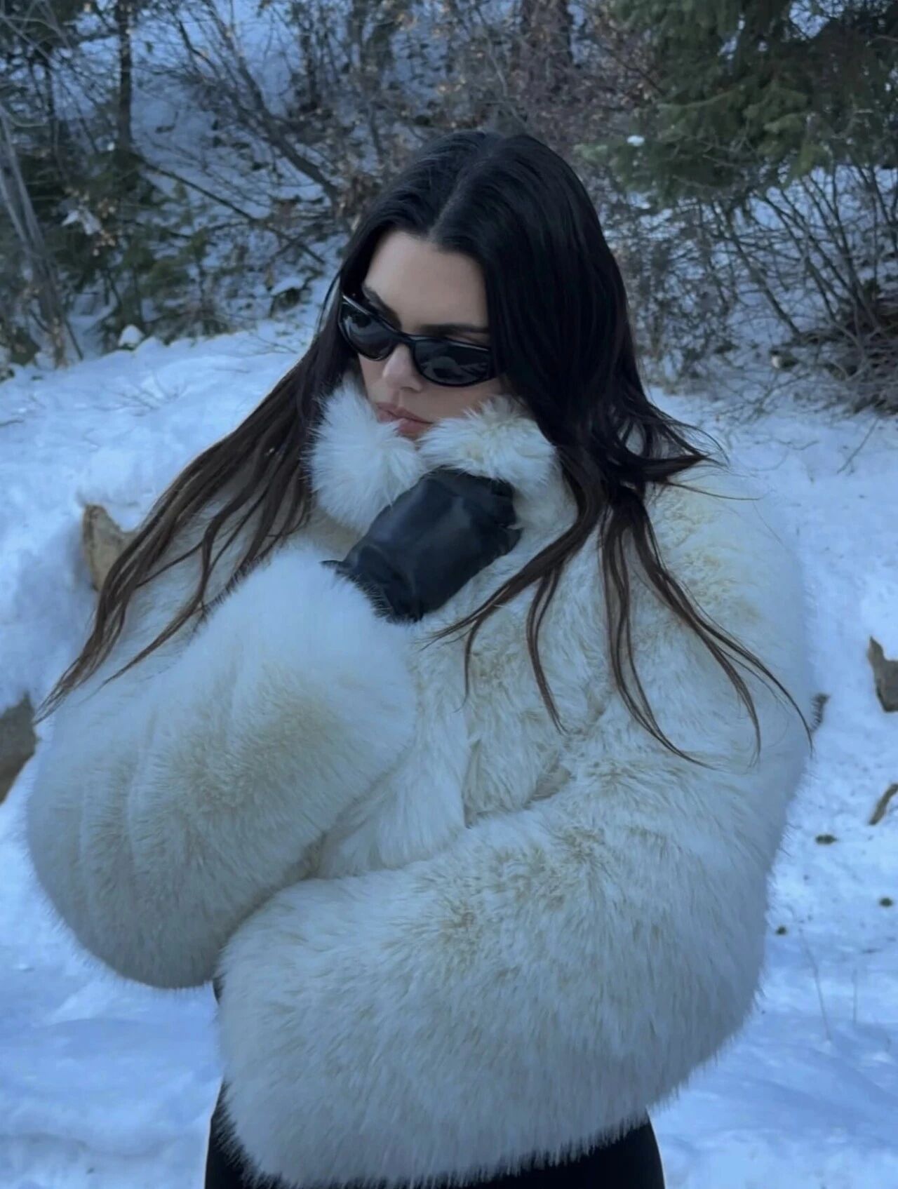 同樣在雪地裡演繹短款皮草穿搭的還有肯豆這組經典的毛茸茸照片,大面積的白色雪景跟白色外套中黑色墨鏡跟皮質手套點綴得格外恰當,這類小單品兼具實用性跟存在感,是冬天搭配選擇的不二之選,超實穿!