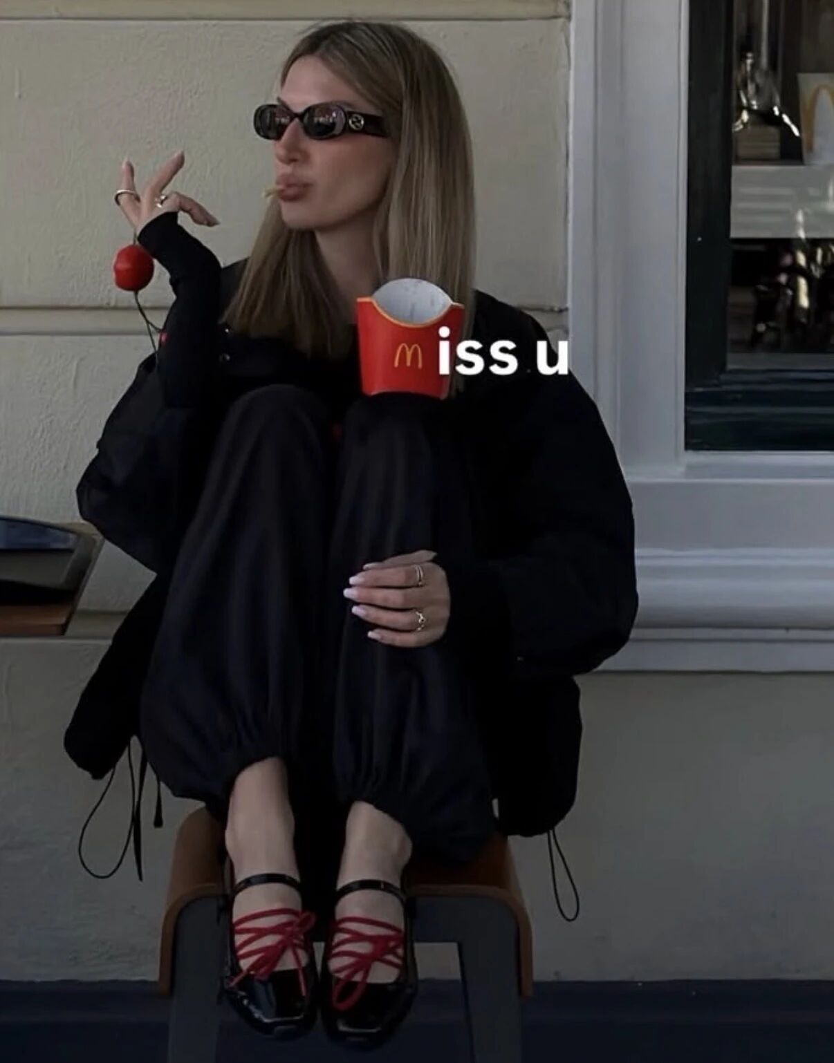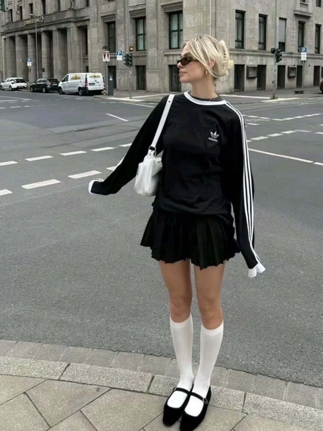 Look 1:鬆弛感練習生 一件寬鬆衛衣配堆堆襪套和芭蕾運動鞋,襪套自然堆疊。上半身鬆垮,下半身輕盈,不刻意卻很有層次。