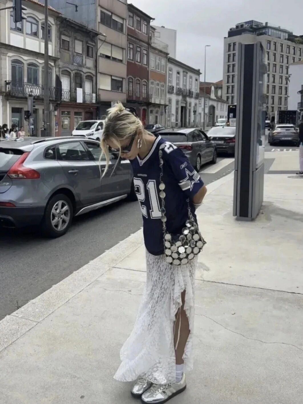 蕾絲褲襪不再老氣,而是與水洗牛仔褲、緞面裙疊穿,玩一場柔與剛的對話。緞面裙也告別了單一甜美,與皮革拼接出動態的流動美。