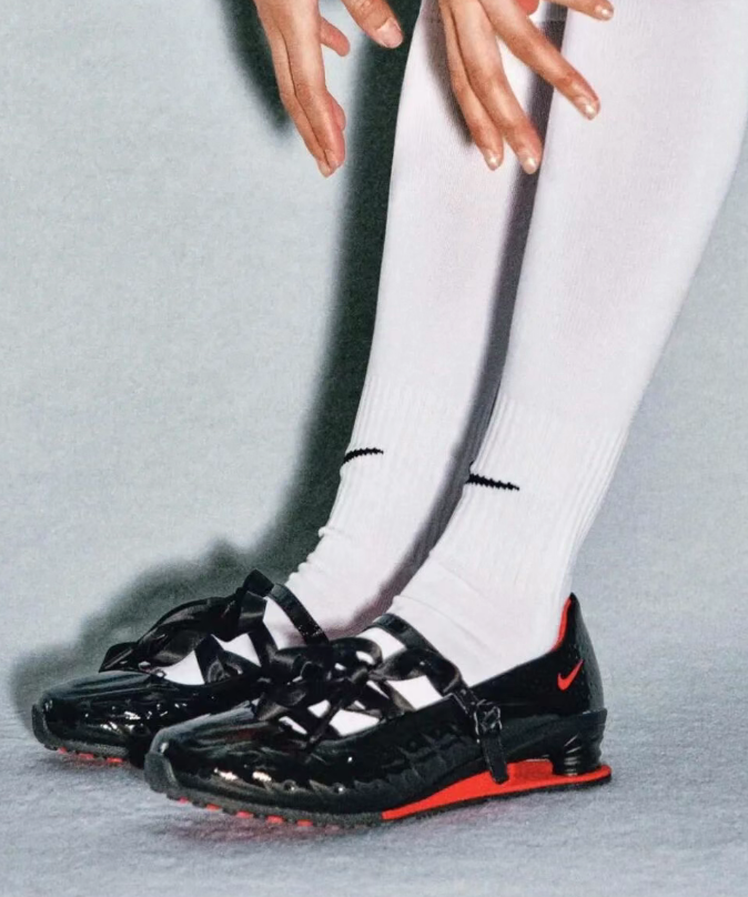 把芭蕾舞鞋的圓頭輪廓和系帶保留,鞋底卻換成了運動科技。像是 Adidas 與 Liberty London 聯名的 Taekwondo Mei,或是最近讓所有人尖叫的 Nike 與 LABELHOOD 蕾虎聯名的 Shox Z Calistra。