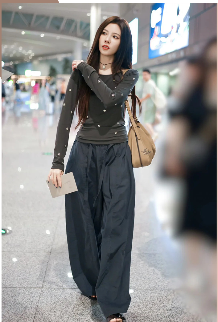 不同風格的穿搭,可以選擇不同面料的泡泡褲,只需考慮造型整體的協調性。宋妍霏這身造型可謂酷颯有型,尼龍面料的灰色泡泡褲立體挺括,表面泛著細膩漸變光澤,上身搭配綴滿水晶鑽細節的短款上衣,利用光影打破沉悶,整體造型透過材質間的明暗交錯,營造出既前衛又高級的視覺層次,超有層次!
