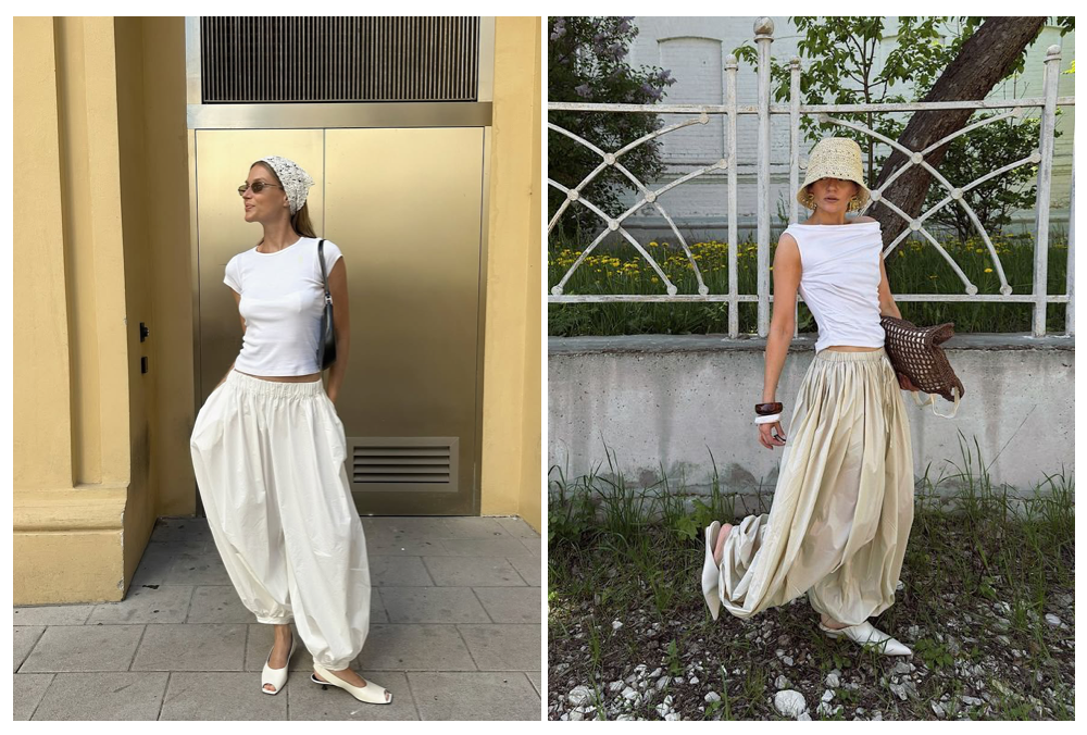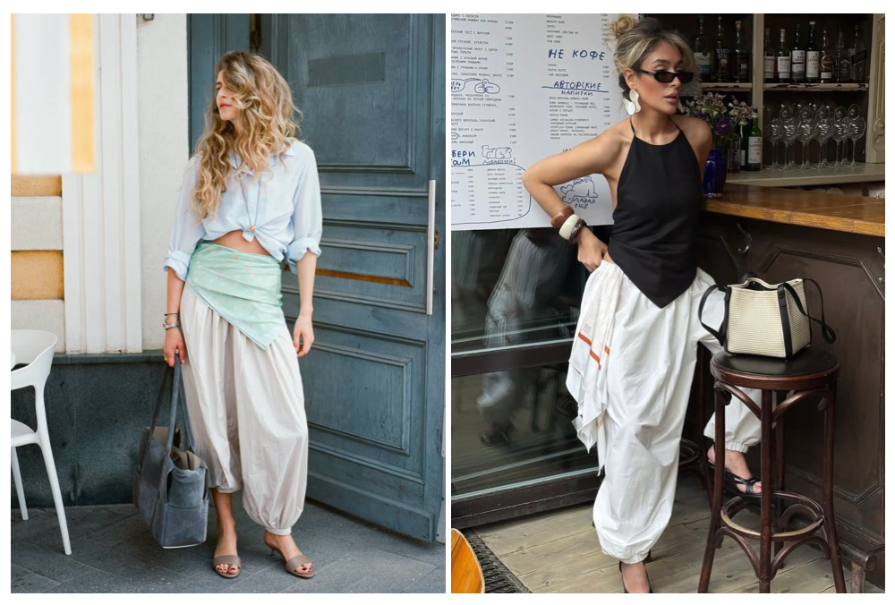 不妨刻意放大泡泡褲的褶皺細節,在腰間輕繫一條絲巾替代腰帶,或將上衣下擺微微捲起,讓衣褶自然堆疊,形成豐富的線條感,整體造型頓時氛圍十足,看起來舒展鬆弛,超有氛圍!
