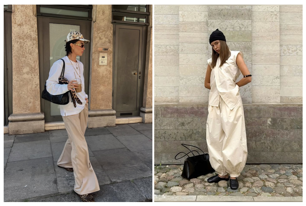 泡泡褲的收腳設計可以突出腳踝,鞋型選擇直接決定風格基調。泡泡褲搭配樂福鞋,中性休閒中注入幾分雅致,尤其配合一身奶油白色系,清爽又知性,時髦又得體,超有品!