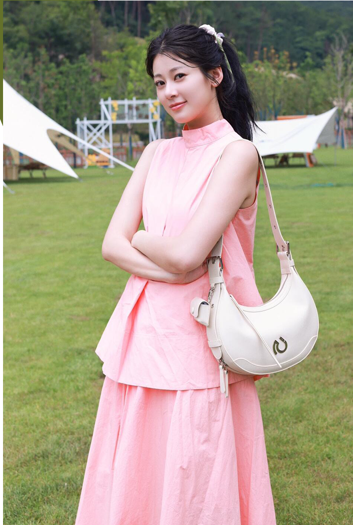 沒有多餘的繁複喧嘩,低飽和色與裸感色系,就像自帶柔光濾鏡般,含蓄又輕柔。趙昭儀只靠柔和的淡粉色與俐落剪裁,便能輕鬆建構出高級感。粉色裙裝巧妙襯托出紅潤好氣色,造型明媚又大方。