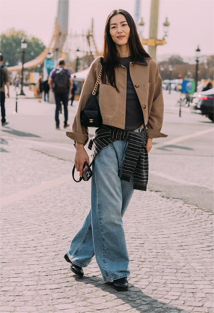 長款直筒牛仔褲+高跟鞋根本是熟齡智慧!褲管寬鬆、剛好到拖地,在高跟鞋上故意堆疊一點,看似「鬆垮」其實超級時髦,舒服又自在!